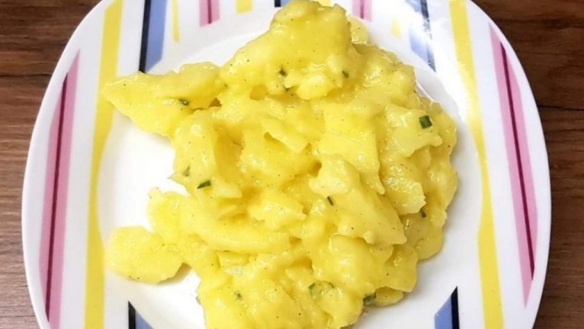 Amalgamate bene, aggiustate di sale e lasciate raffreddare in frigorifero per qualche ora, mescolando ogni tanto in modo che le patate assorbano il condimento in cui sono immerse e che la superficie, spappolandosi un po’, renda tutto cremoso.