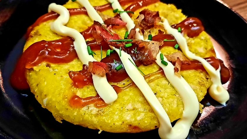 L’Okonomiyaki è decorato con due salse, la maionese, una salsa agrodolce facile da preparare, fiocchi di tonno essiccato, detti bonito e alghe Nori essiccate.