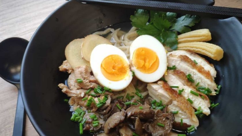 Guarnite il vostro Ramen con gli ingredienti scelti: qualche fettina di maiale chashu, qualche fettina di pollo cotto in padella, le uova marinate, dei funghi trifolati, semplicemente saltati in padella con olio e aglio e delle pannocchiette di mais.